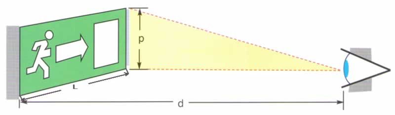 Dimensions des signaux de secours. La hauteur minimale (p) du signal de secours dépend de la plus grande distance (d) à laquelle il doit pouvoir être identifié. On applique la formule ci-dessous: